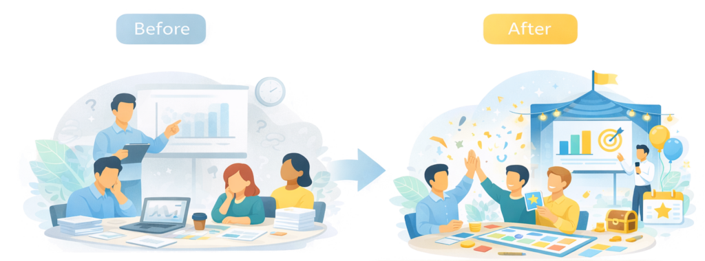 私たちはゲーミフィケーションを活用した体験型プログラムを通じて、心理的安全性の向上、主体性の促進、そして組織内のコミュニケーション活性化を支援します。